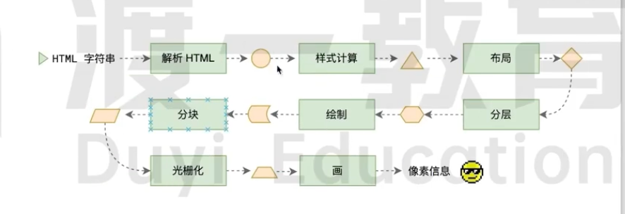 渲染流程的主要步骤,html解析、样式计算、布局、分层、绘制、分块、光栅化、画。通过这个流水线完成页面的渲染。