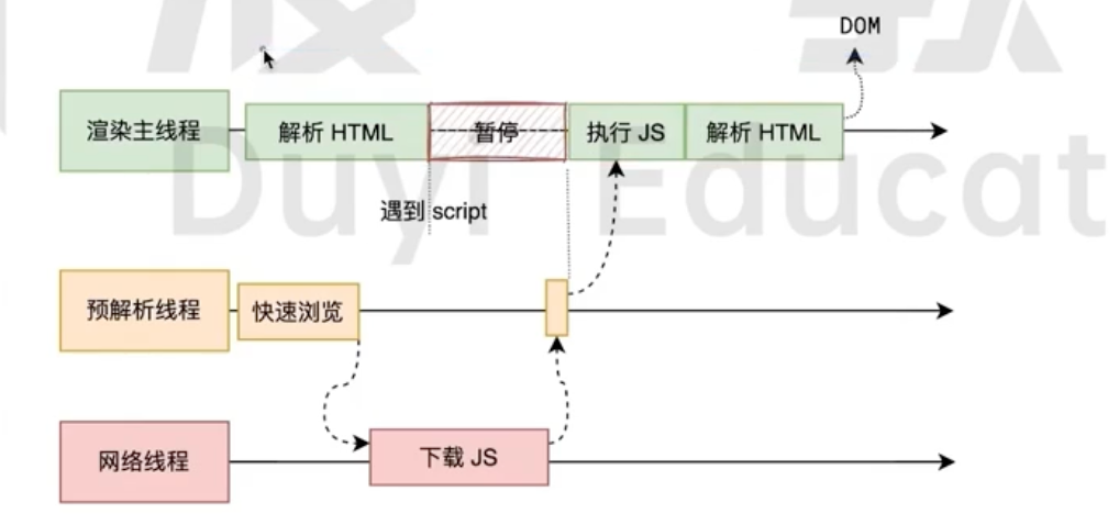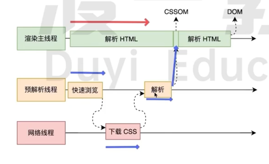 HTML文档的解析,在解析前,预解析线程工作,率先发起请求下载HTML中外部的css、js文件。